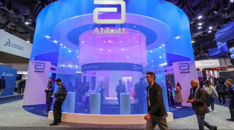 Attendees walk by the Abbott booth during CES 2024 at the Las Vegas Convention Center on January 10, 2024 in Las Vegas, Nevada.
