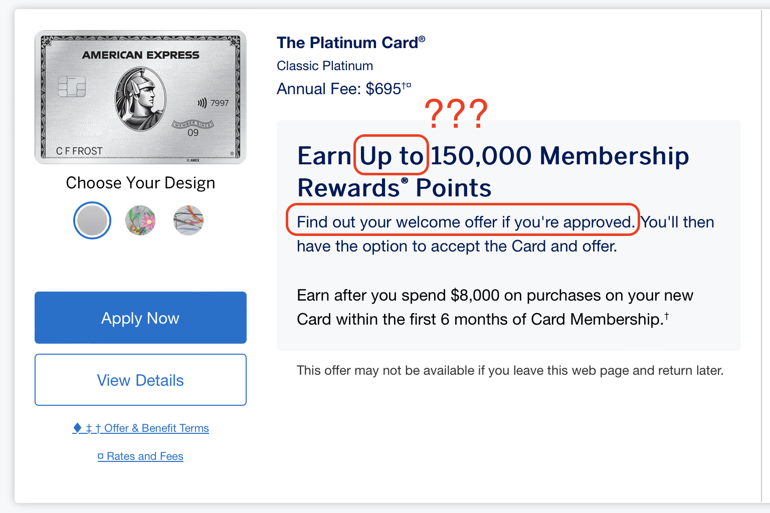 Since we updated the new link for the 150k welcome bonus for the AmEx Platinum a few days ago, many attentive readers have discovered that the terms of this 150k offer are written as ‘Up to 150,000’, followed by ‘Find out your welcome offer if you’re approved.’ This means that you only find out how much of a welcome bonus you will receive after you apply and are approved by AmEx! This is quite disgusting.