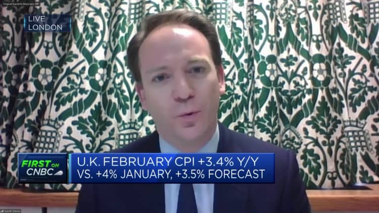 Headline inflation slid by more than expected to an annual 3.4% in February, hitting its lowest level since September 2021, data showed Wednesday. The central bank expects the consumer price index to return to its 2% target in the second quarter, as the household energy price cap is once again lowered in April.