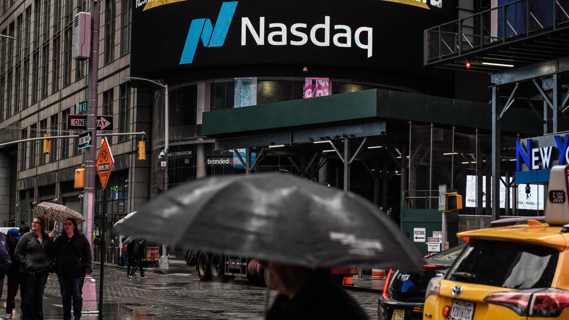 Signage outside the Nasdaq MarketSite in New York on March 23, 2023.