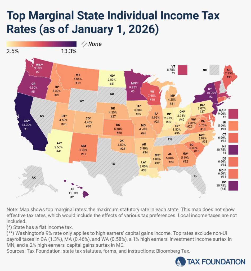 According to the Tax Foundation, at the start of 2026, seven states have zero income tax: Nevada, Wyoming, South Dakota, Texas, Florida, New Hampshire, and Tennessee. And, low rates can be found in Arizona (2.5%), North Dakota (2.5%), Ohio (2.75%), Indiana (2.95%), and Louisiana (3%).