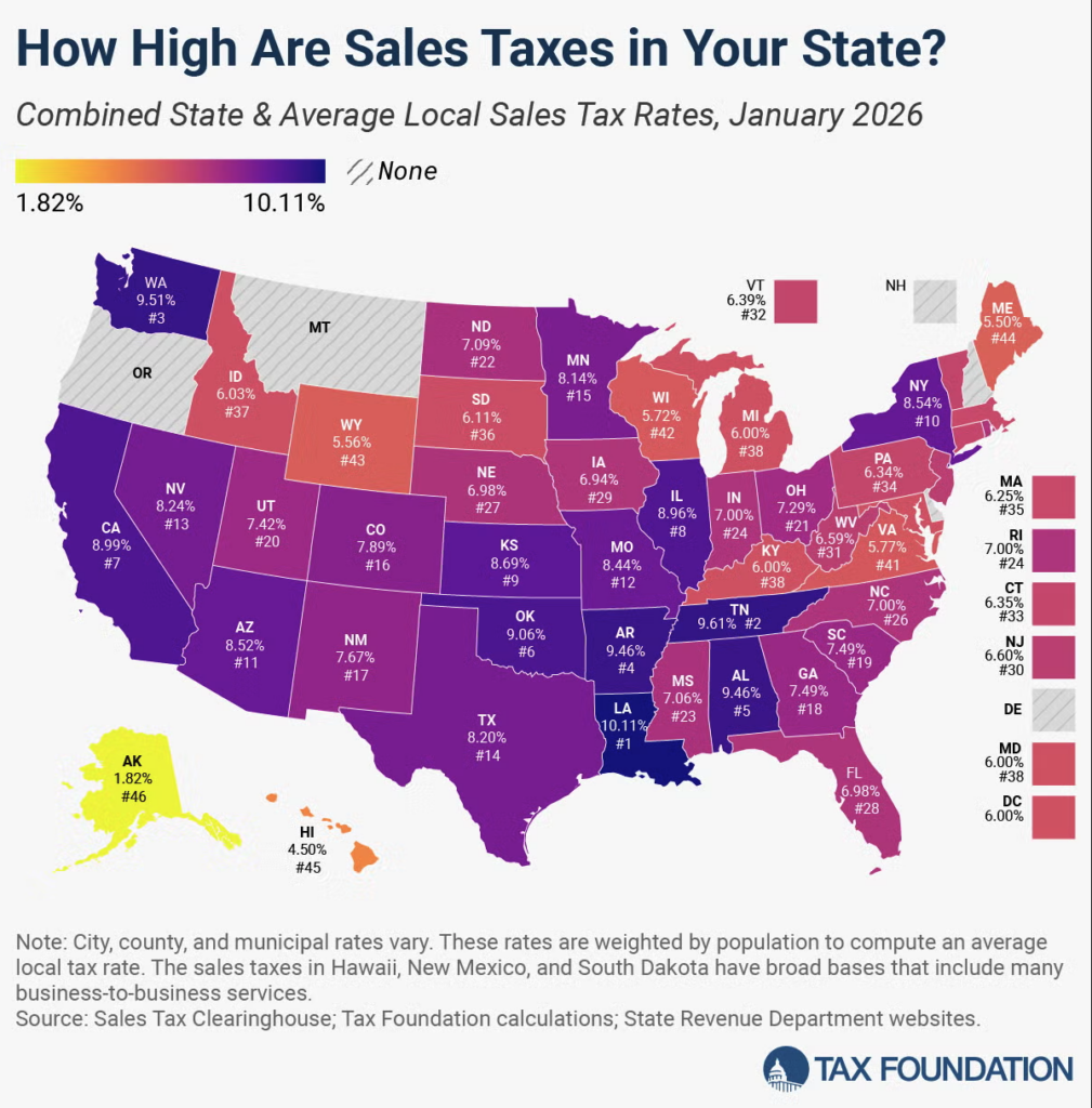 The Tax Foundation also assesses sales taxes by state. Forty-five states levy a state-level sales tax, and 38 states allow local sales taxes (including Alaska, which has no statewide tax).